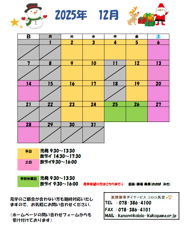 受け入れカレンダー【12月】
